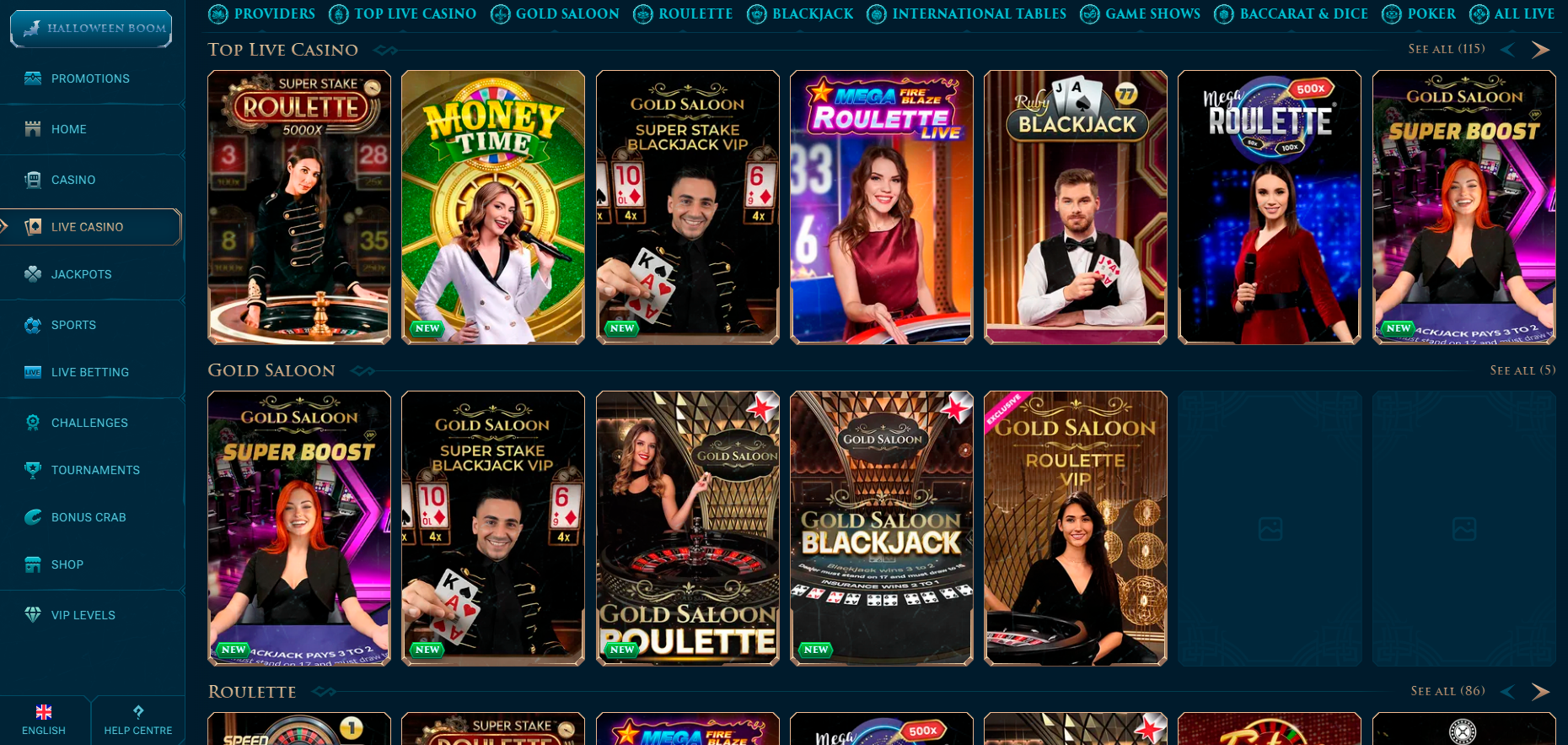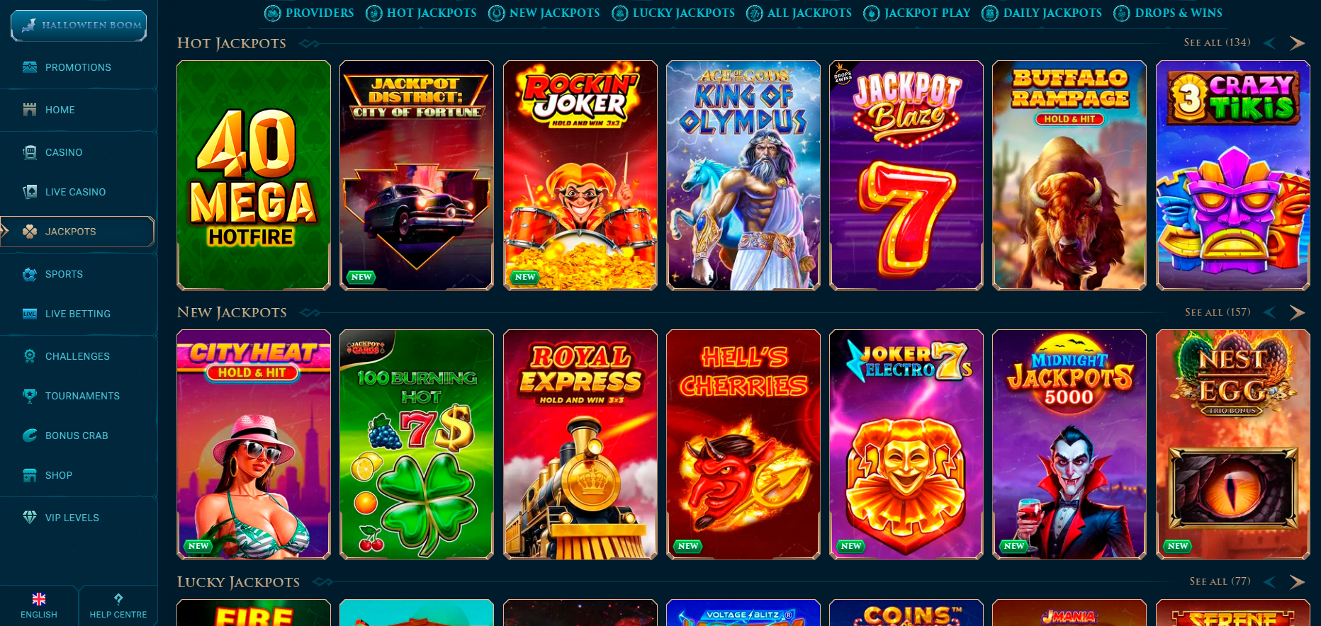 The platform hosts 4,000+ titles from 40+ providers. Slots are full versions with original RTP and volatility. Live games are streamed from Evolution, Ezugi and Pragmatic Play studios. Jackpot slots are linked to global networks Mega Moolah, Age of the Gods, Hall of Gods and Must-Drop. Table games are available in classic rules and bonus-bet variants. Video poker includes Jacks or Better, Deuces Wild and Aces & Faces.